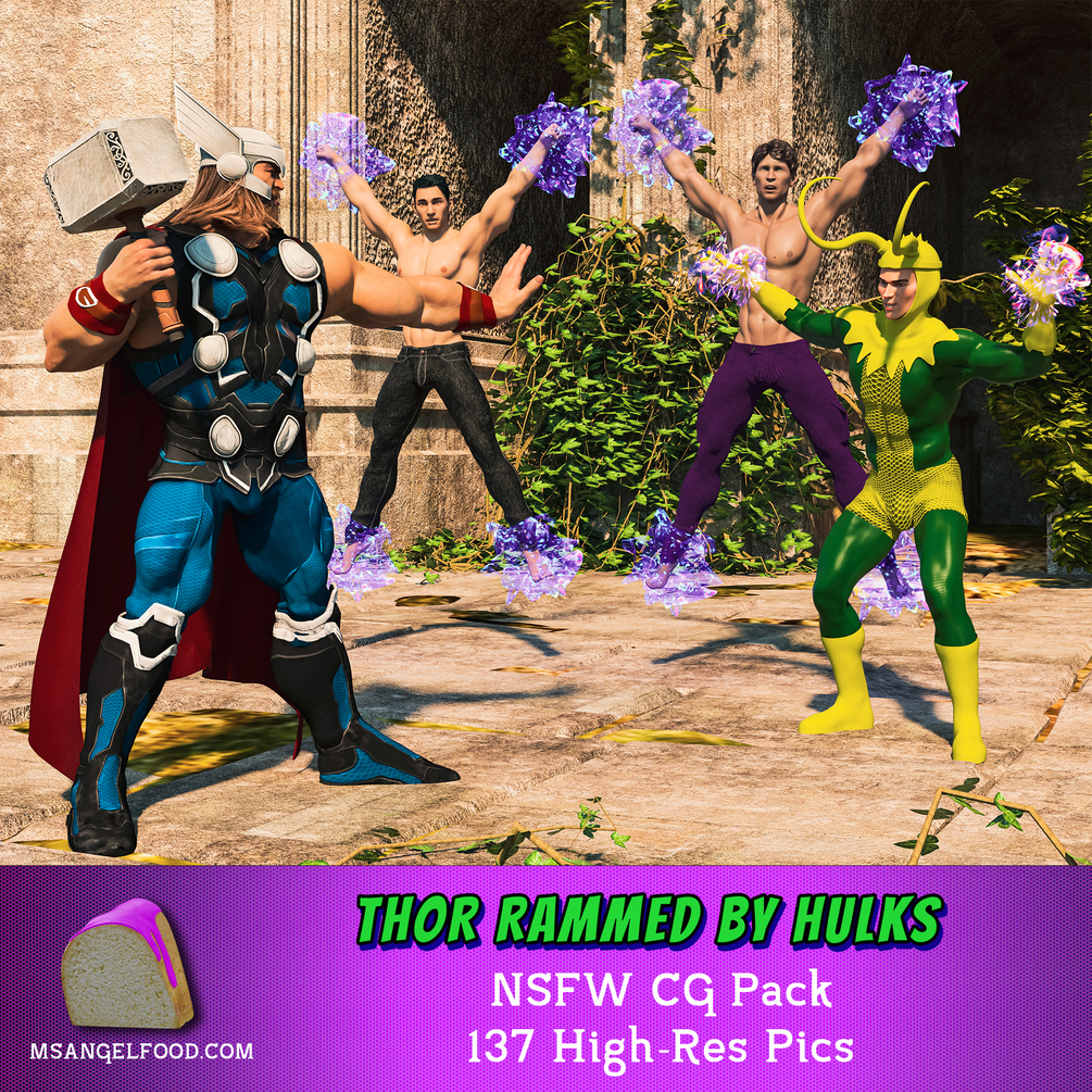 Loki has captured two men, and Thor's here to save them. However, Loki has set a trap for the God of Thunder. The men transform, massively growing their muscles until they're both Hulk-sized monsters. Thor is no longer there to rescue them, but to satisfy their physical needs.